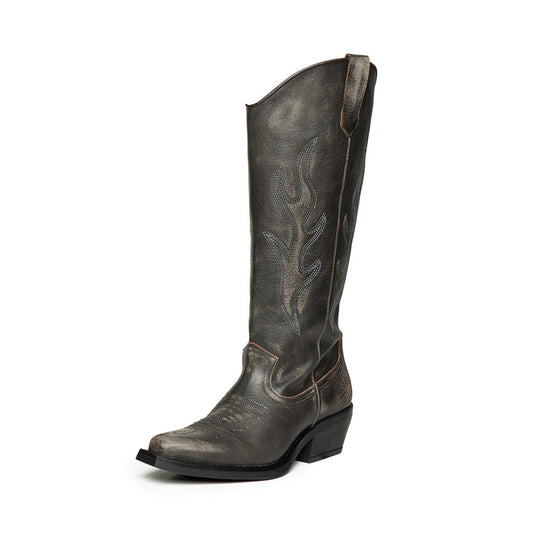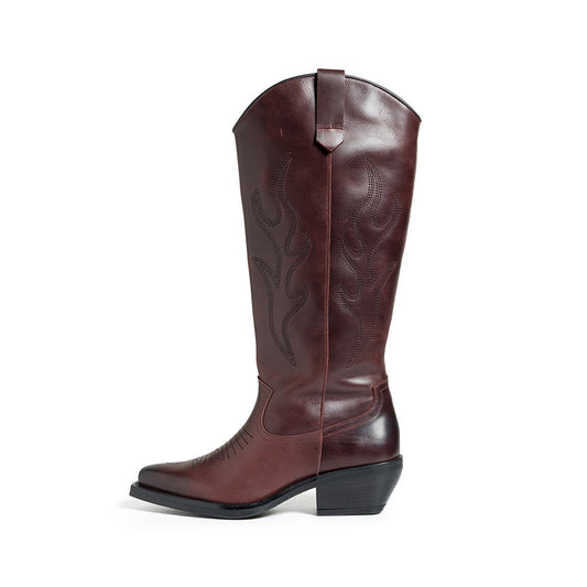 Dark Brown Snip-Toe Flame Embroidery Wide Calf Knee High Cowgirl Boots