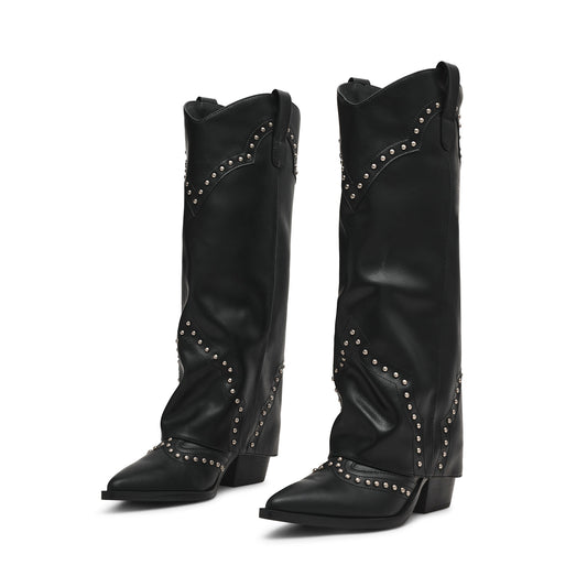 Black Pointed-Toe Studded Fold-Over Wide Calf Knee High Cowgirl Boots