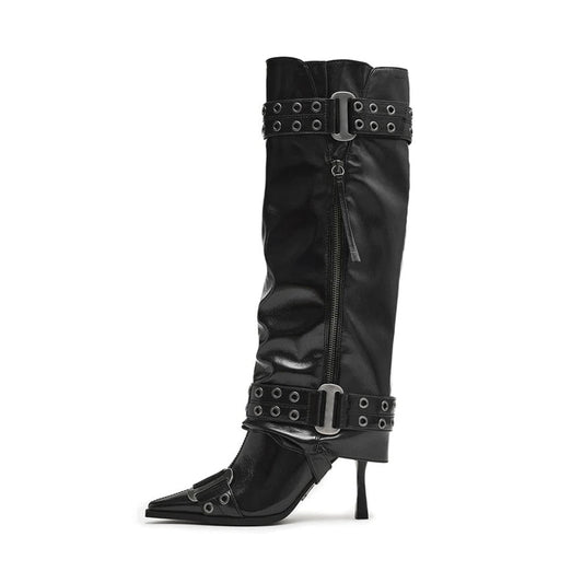 Black Pointed-Toe Half-Zip Buckle Straps With Eyelets Knee High Stiletto Boots