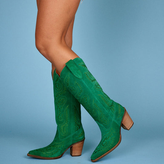 Green Faux Suede Snip-Toe Lively Embroidery Wide Calf Knee High Cowgirl Boots