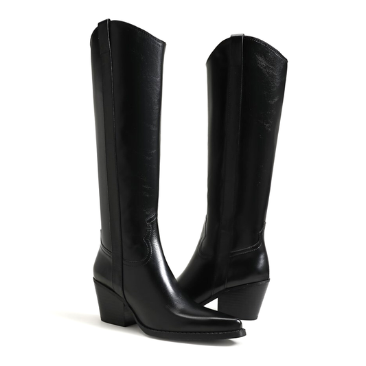Black Pointed-Toe Half-Zip Knee High Cowgirl Boots