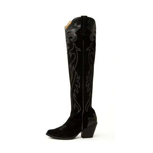 Black Faux Suede Round-Toe Half-Zip Embroidery Tall Knee High Cowgirl Boots