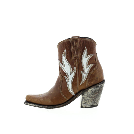 Tan Pointed-Toe Flame Applique Ankle Cowgirl Boots