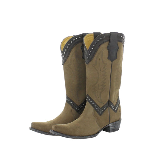 Khaki Faux Suede Snip-Toe Embroidery Studded Mid Calf Cowgirl Boots