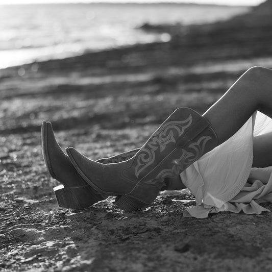 Gray Faux Suede Snip-Toe Studded Fold-Over Full-Zip Mid Calf Cowgirl Boots
