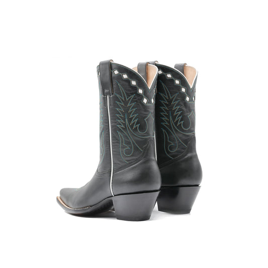 Black Snip-Toe Embroidery And Inlay Mid Calf Cowgirl Boots