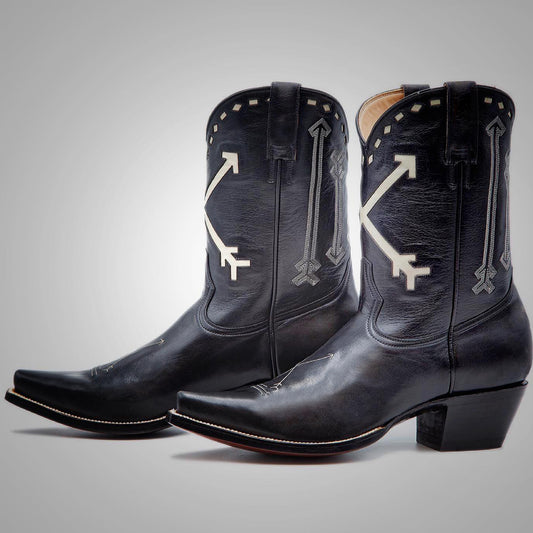 Black Snip-Toe Embroidery "X" Inlay Ankle Cowgirl Boots