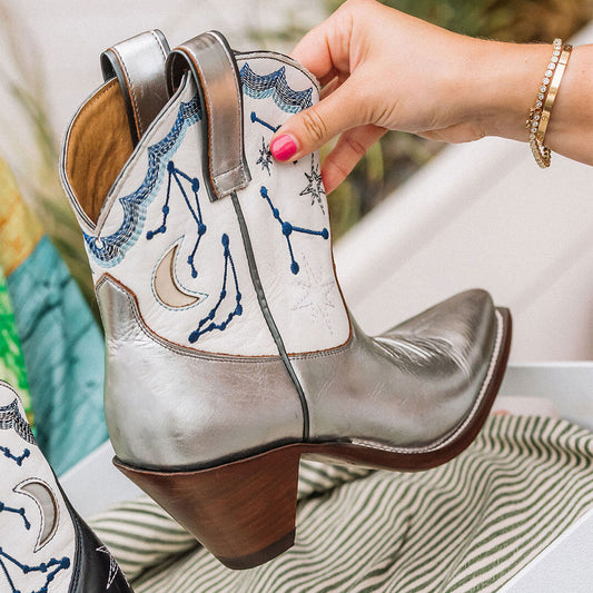 Contrast White And Metallic Silver Snip-Toe Cosmic Embroidery Moon Inlay Ankle Cowgirl Boots