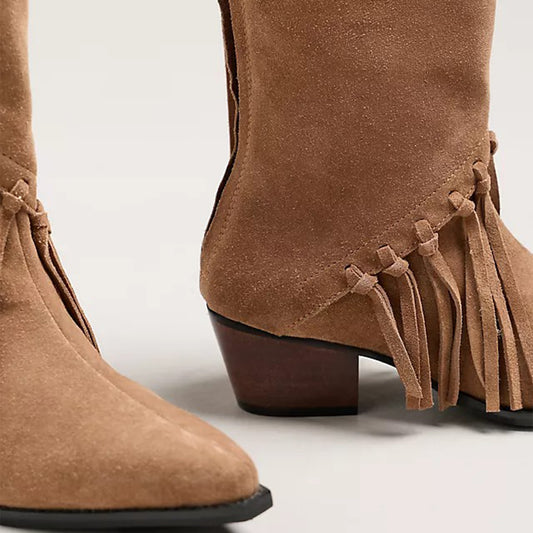 Camel Faux Suede Pointed-Toe Western Mid Calf Cowgirl Boots
