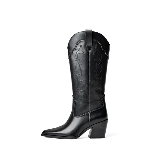 Black Pointed-Toe Embroidery Mid Calf Cowgirl Boots