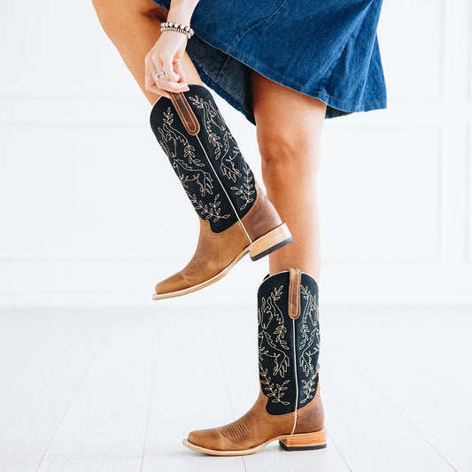 Contrast Navy And Brown Square-Toe Western Embroidery Mid Calf Cowgirl Boots