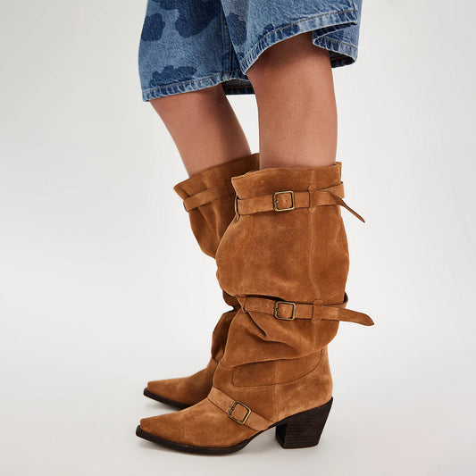 Tan Faux Suede Snip-Toe Three Buckle Straps Wide Calf Knee High Cowgirl Boots