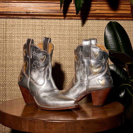 Metallic Silver Snip-Toe Embroidery Metallic Gold Heart Inlay Ankle Cowgirl Boots