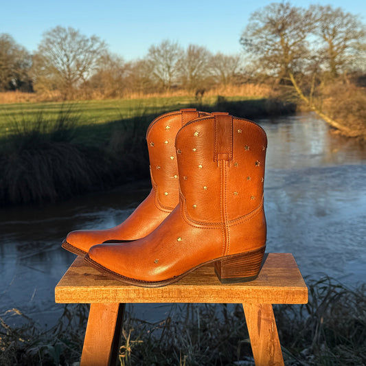 Cognac Snip-Toe Little Stars Inlays Ankle Cowgirl Boots