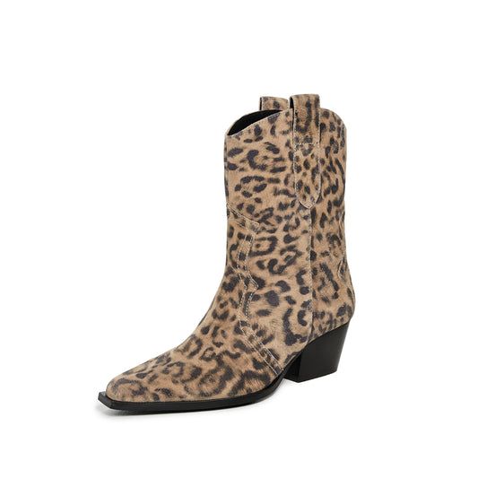 Leopard Faux Suede Pointed-Toe Ankle Cowgirl Boots