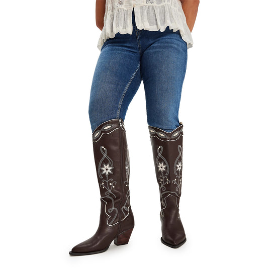 Chocolate Pointed-Toe Ivory Embroidery Flower Inlay Full-Zip Knee High Cowgirl Boots