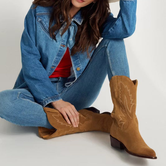 Caramel Faux Suede Almond-Toe Embroidery Mid Calf Cowgirl Boots
