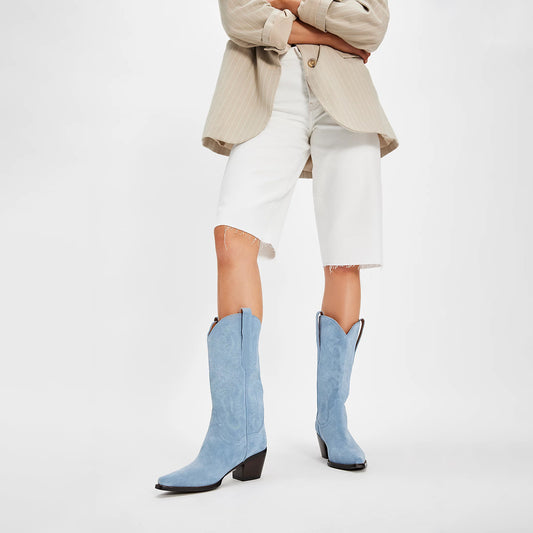 Blue Faux Suede Snip-Toe Classic Embroidery Mid Calf Cowgirl Boots