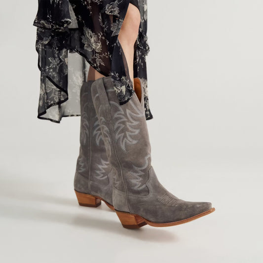 Charcoal Faux Suede Snip-Toe Embroidery Mid Calf Cowgirl Boots