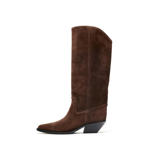 Brown Faux Suede Almond-Toe Simple Mid Calf Cowgirl Boots