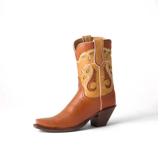 Contrast Tan And Cognac Snip-Toe Inlays Ankle Cowgirl Boots