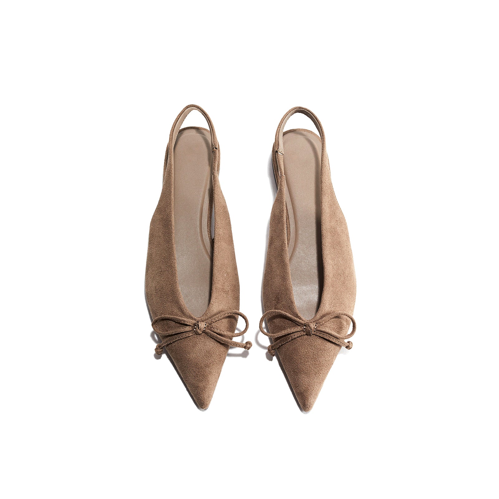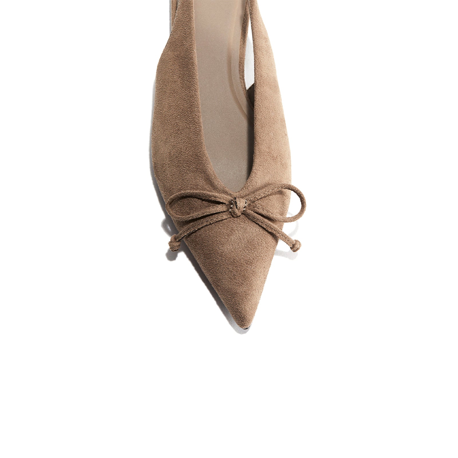 Beige Faux Suede Pointed-Toe Front Bow Slingback Flats.