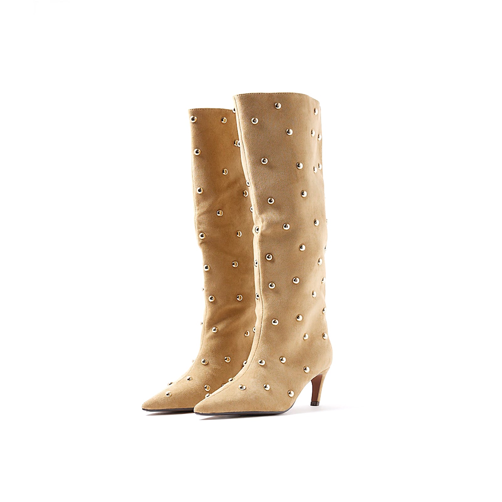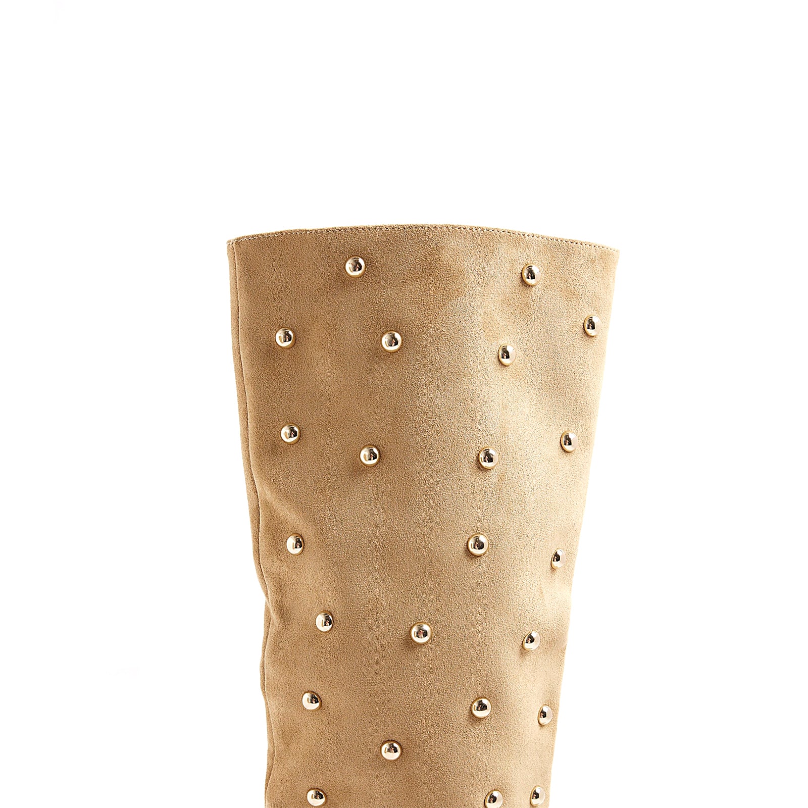 Beige Faux Suede Pointed-Toe Studded Wide Calf Knee High Stiletto Boots.