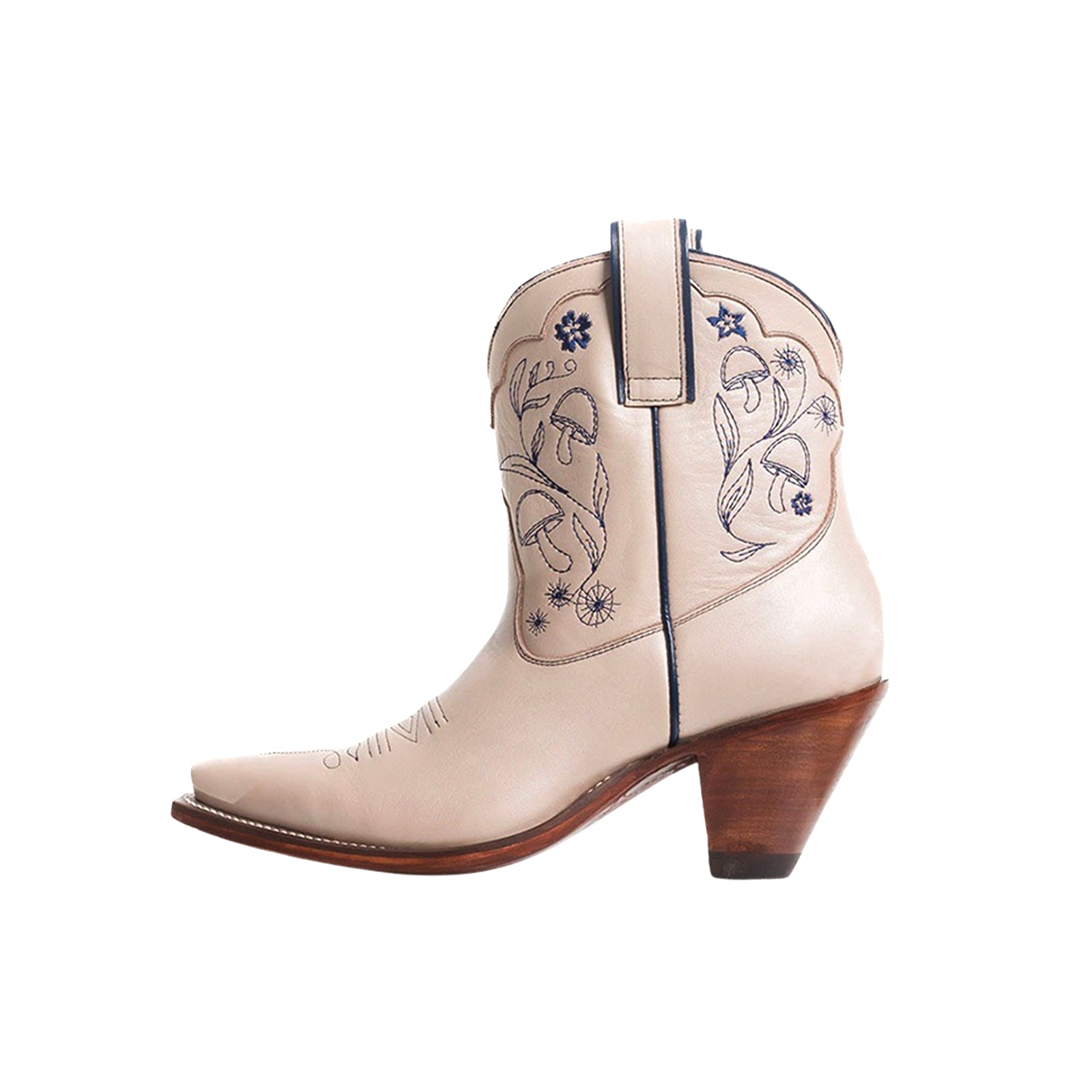 Beige Snip-Toe Mushroom Embroidery Ankle Cowgirl Boots