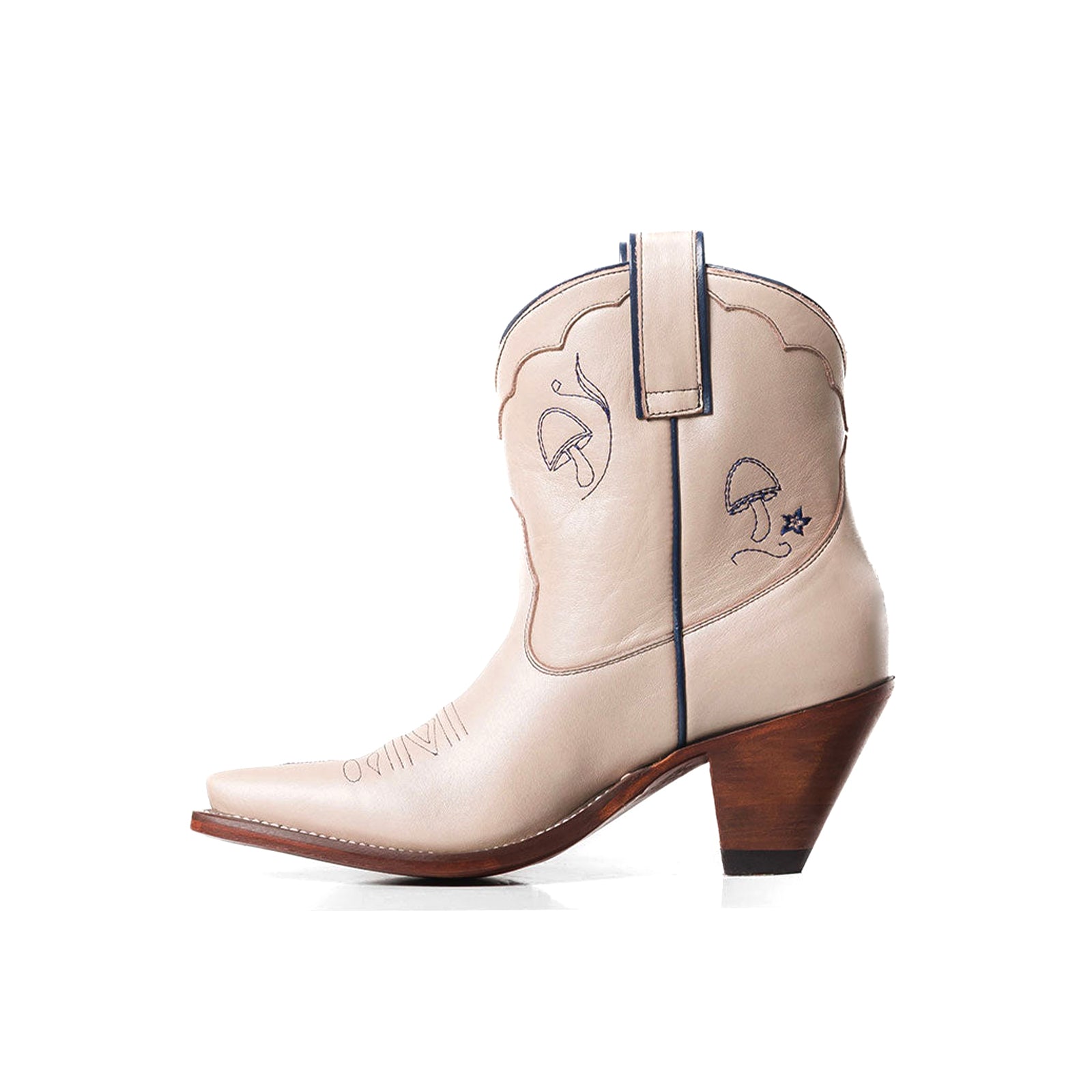 Beige Snip-Toe Mushroom Embroidery Ankle Cowgirl Boots.