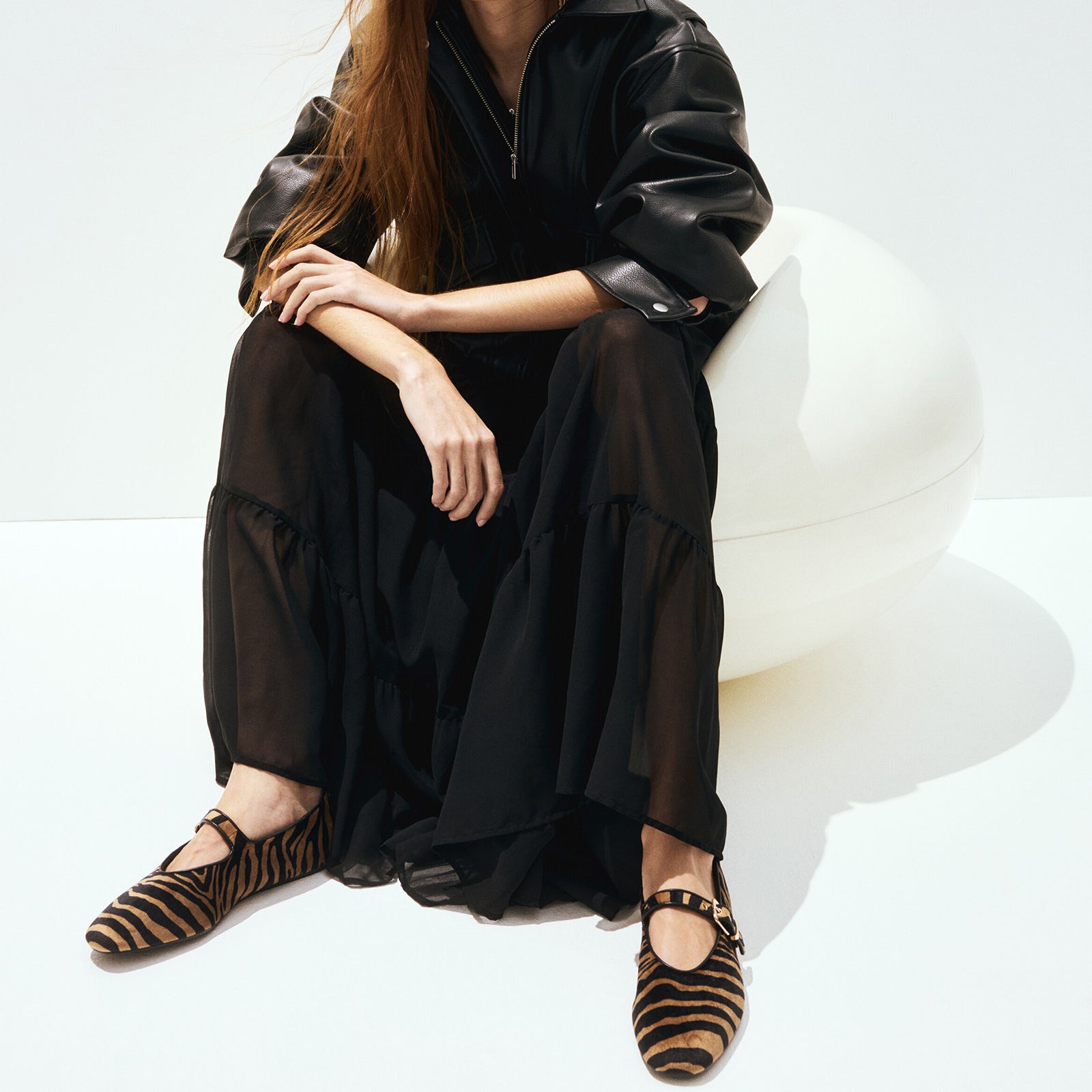 Beige Zebra Pony Hair Square-Toe Bridge Strap Ballet Flats.