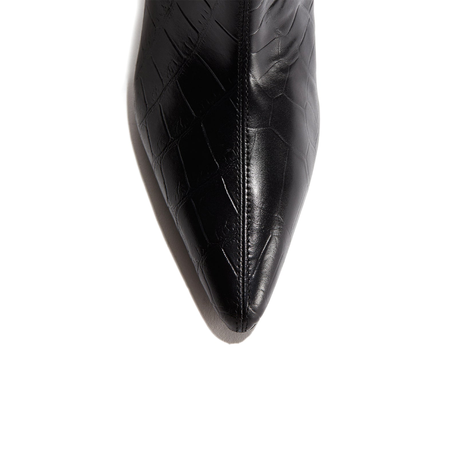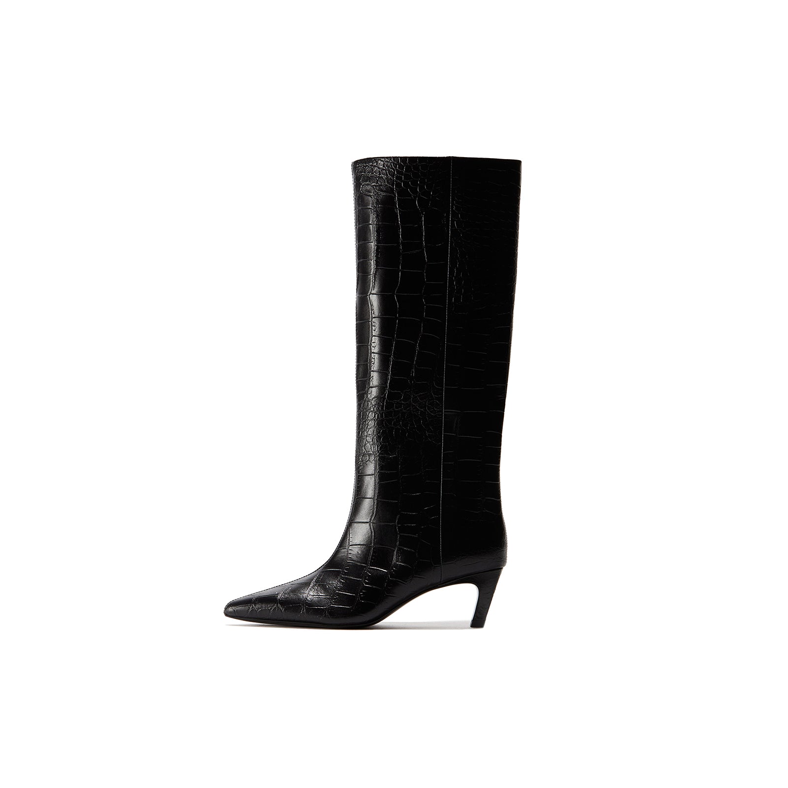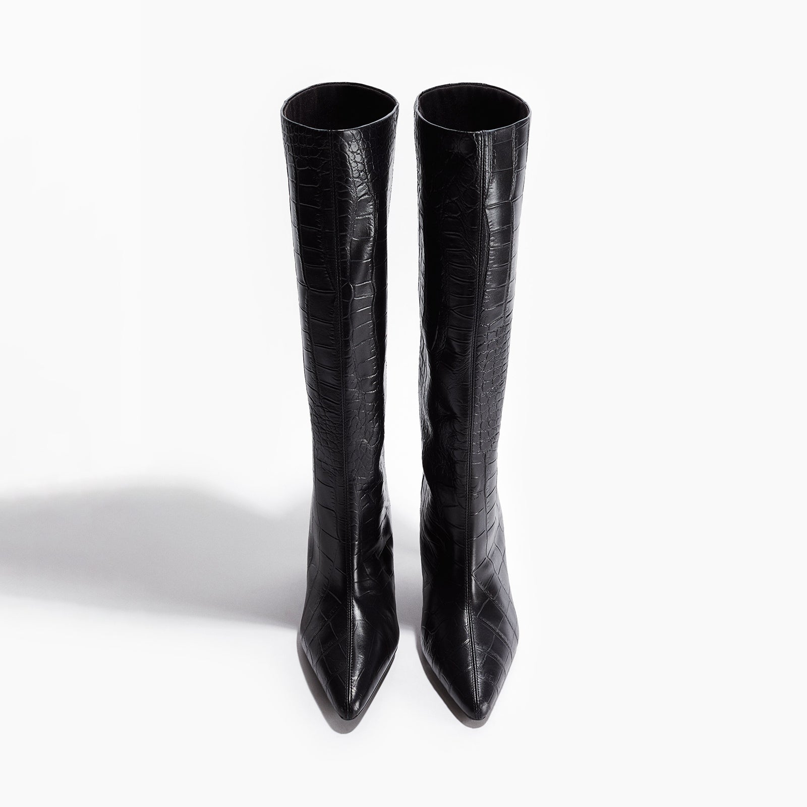 Black Crocodile Print Pointed-Toe Wide Calf Knee High Simple Stiletto Boots.