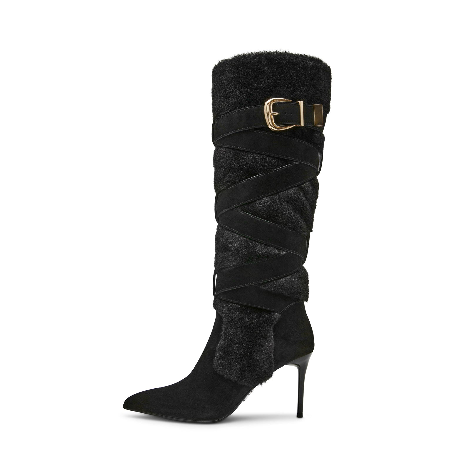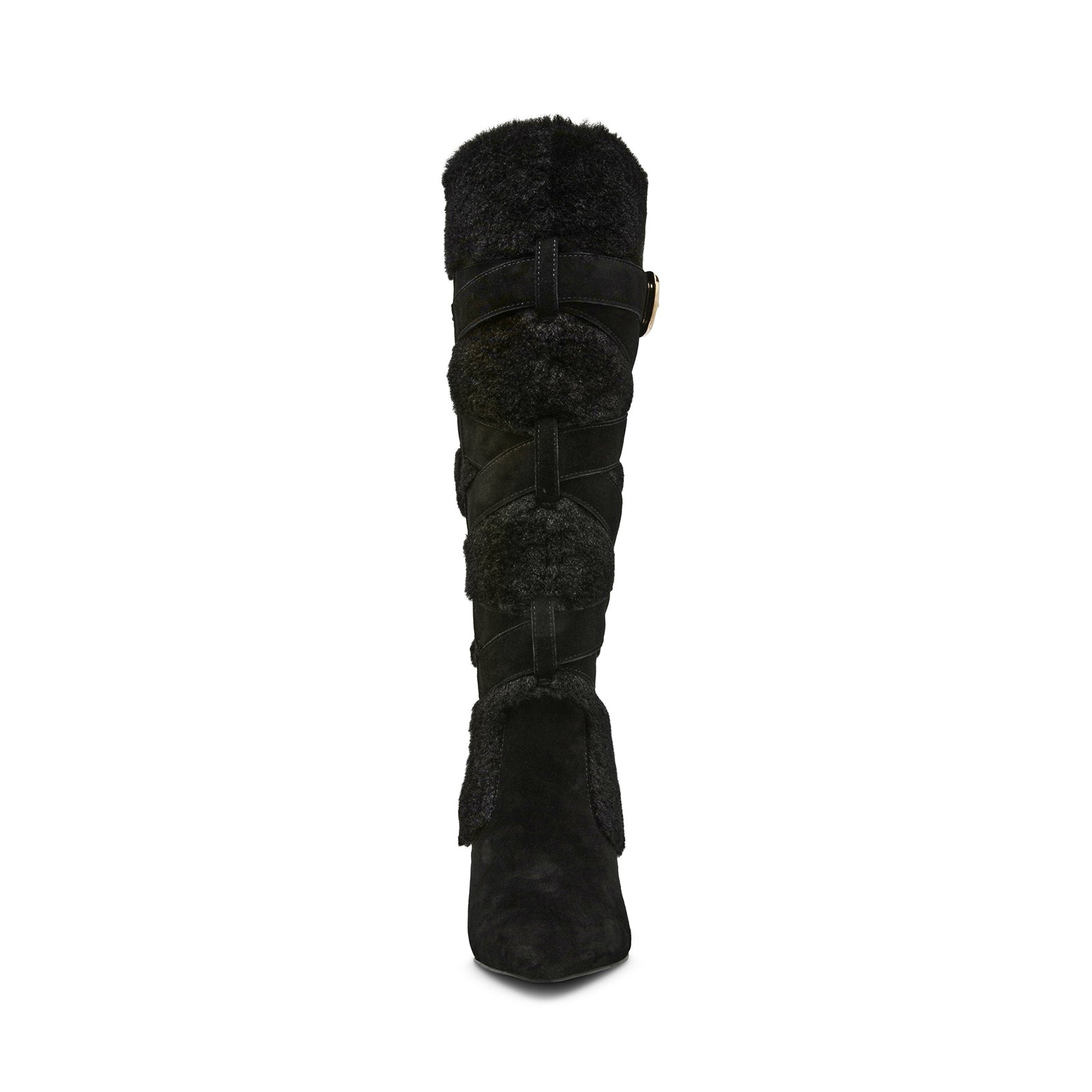 Black Faux Suede Contrast Plush Pointed-Toe Full-Zip Buckle Knee High Stiletto Boots.