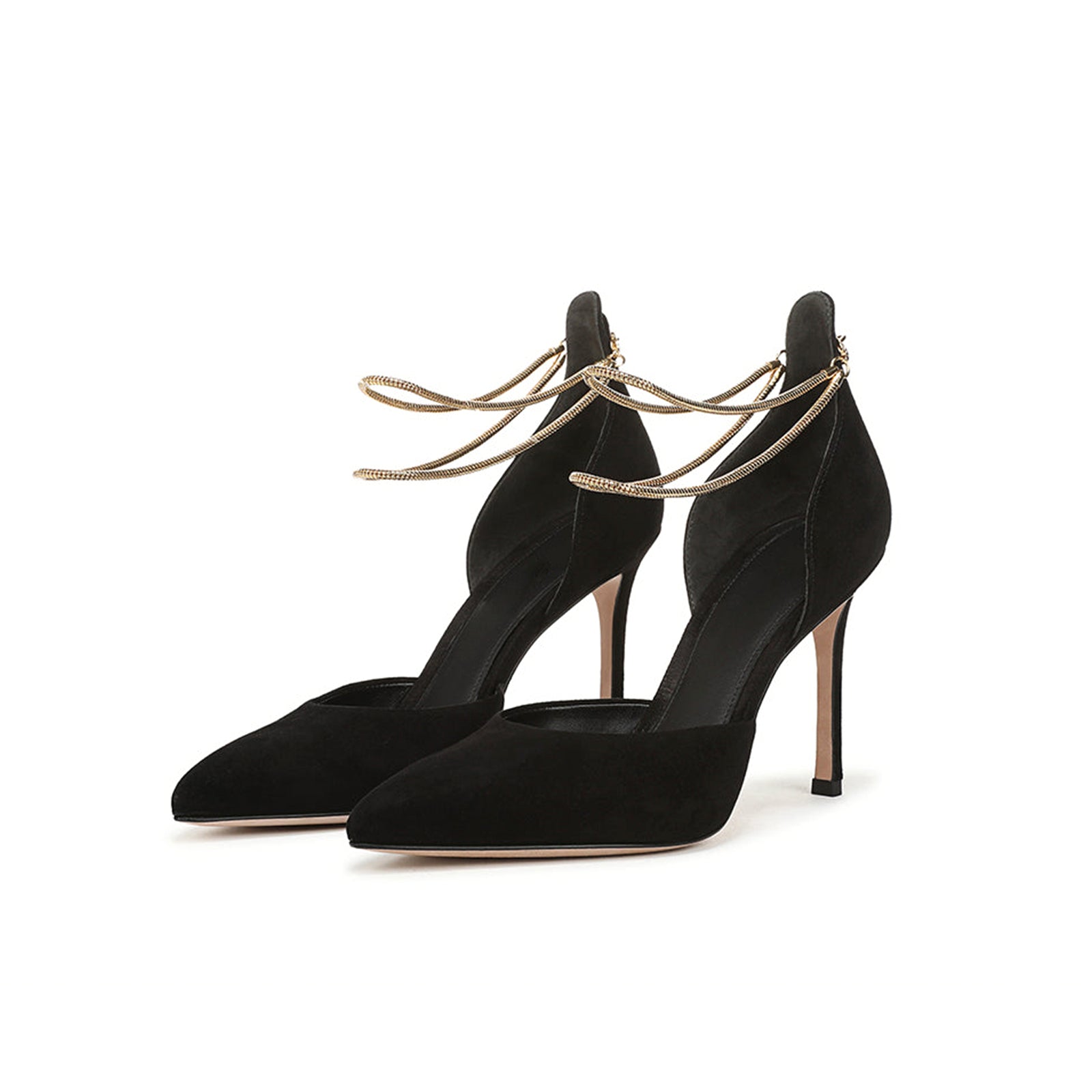 Black Faux Suede Pointed-Toe Double Gold Ankle Chains High Heels.