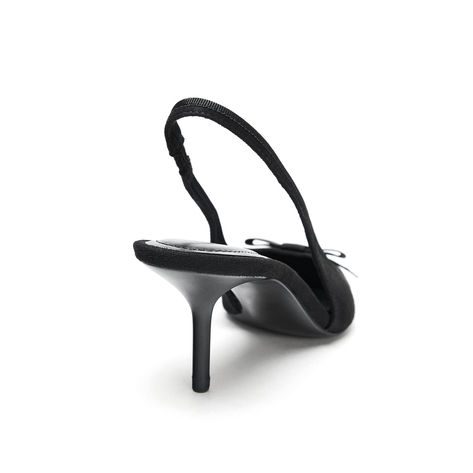 Black Faux Suede Pointed-Toe Front Satin Bow Slingback Kitten Heels.