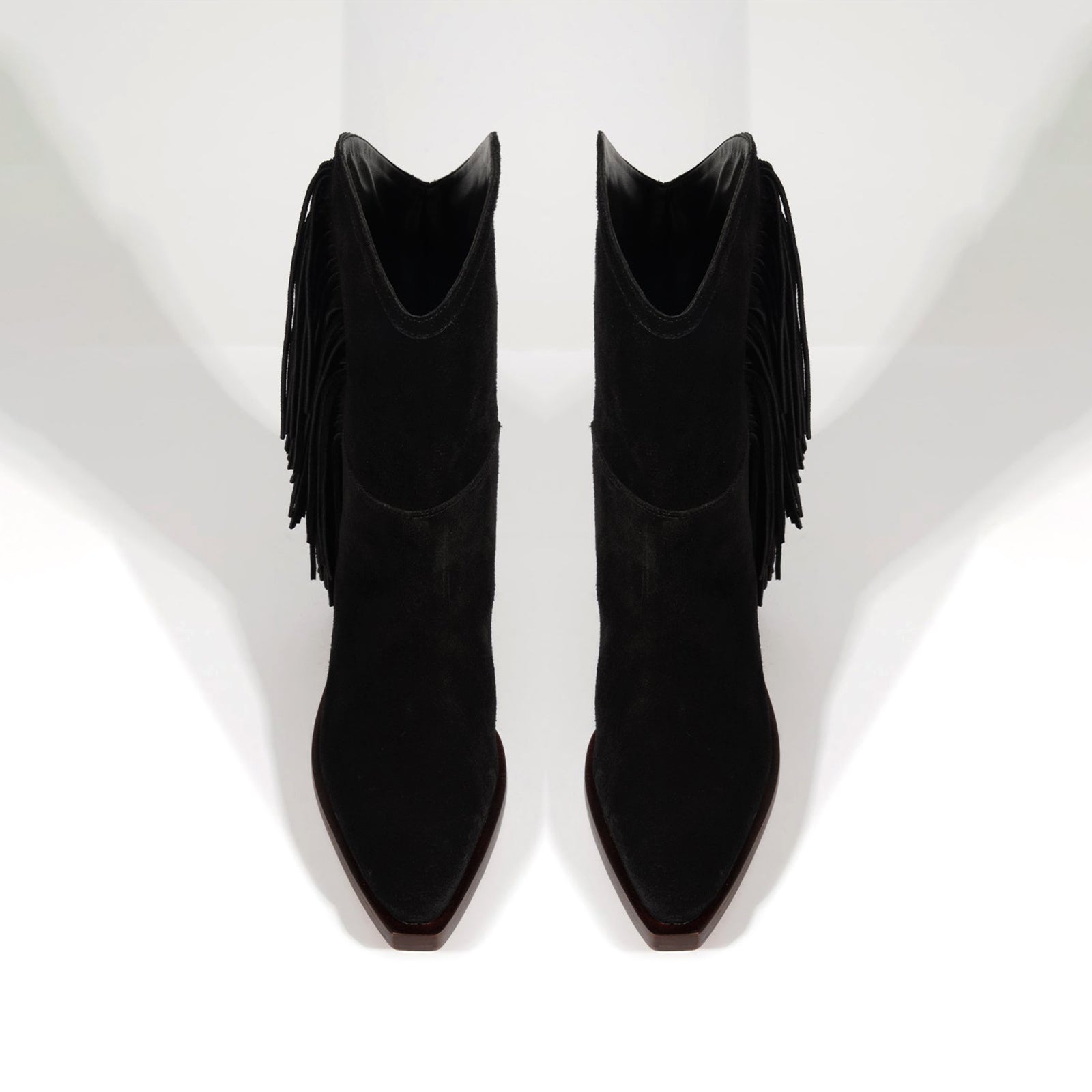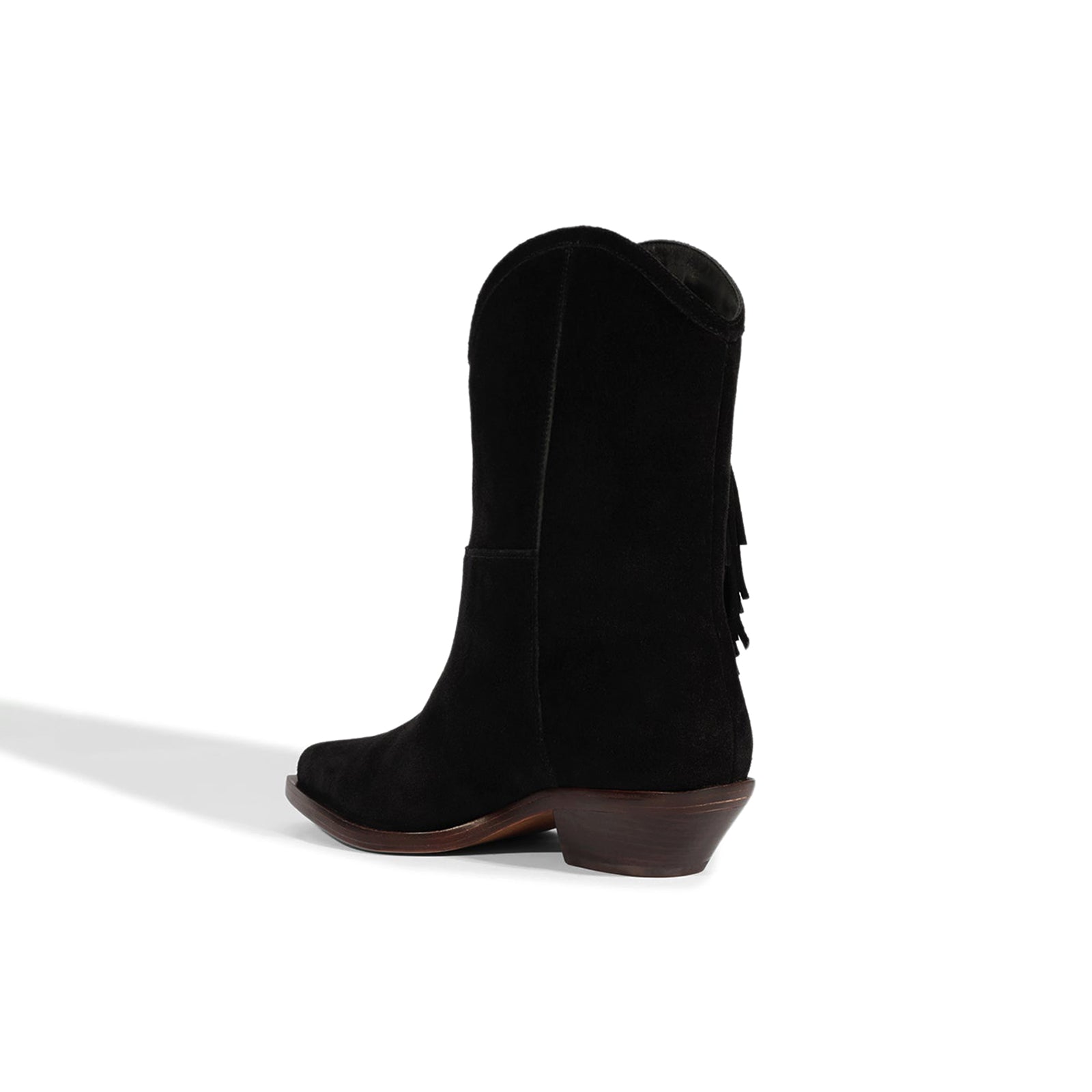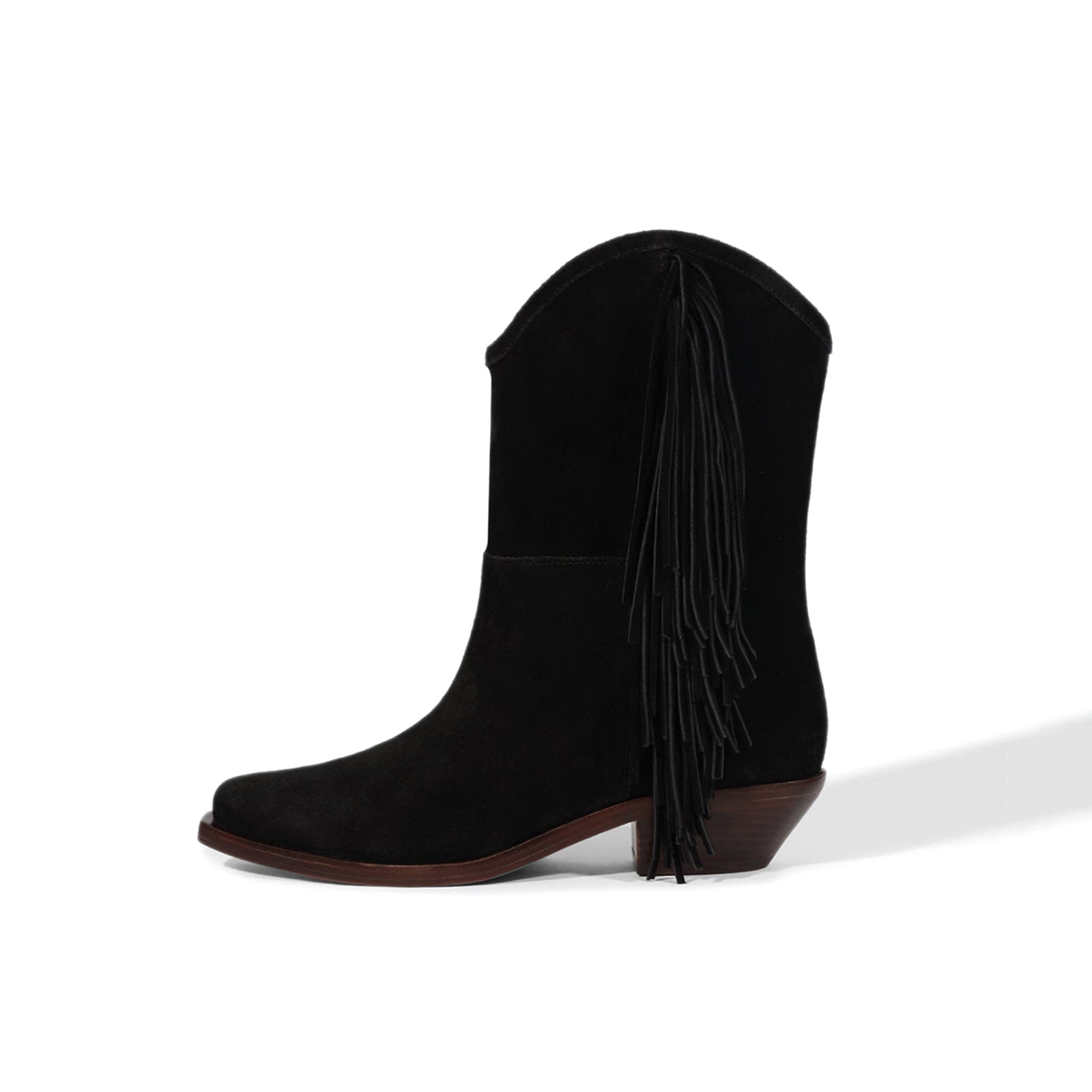Black Faux Suede Pointed-Toe Side Fringe Mid Calf Cowgirl Boots.