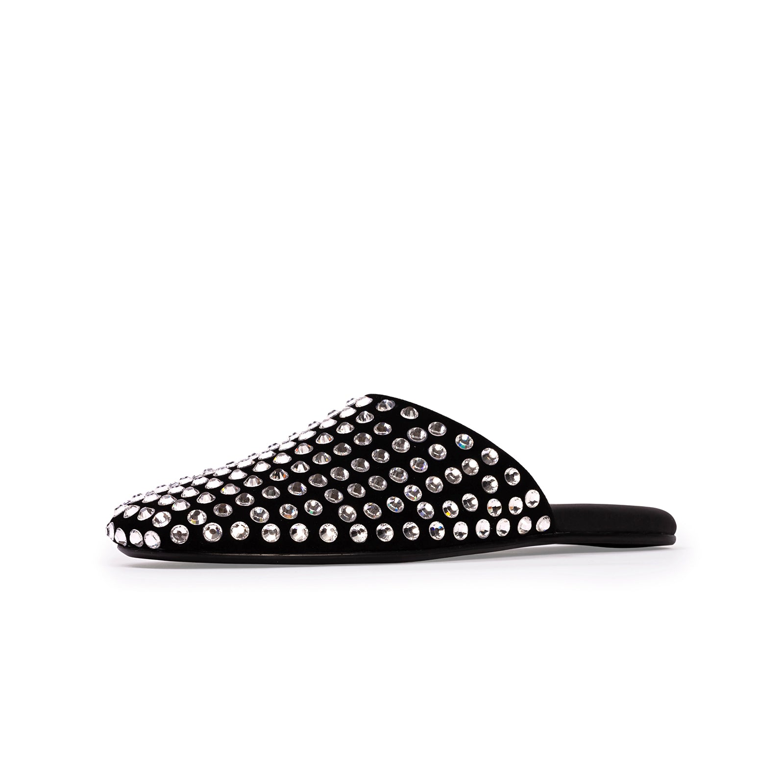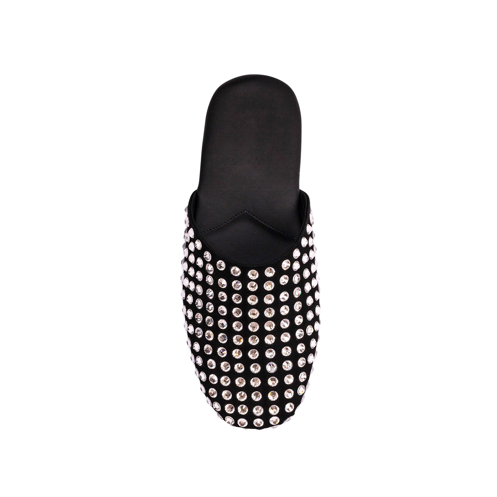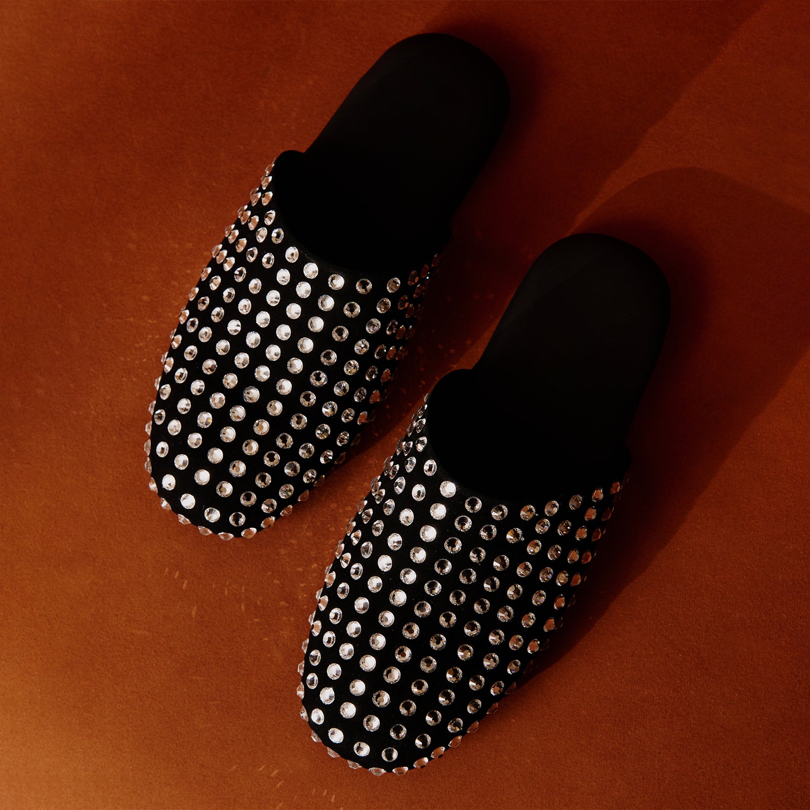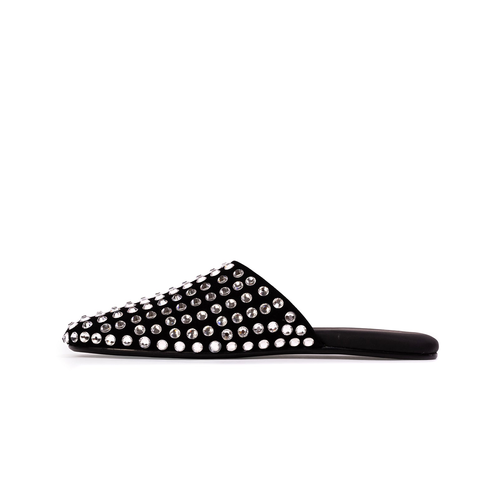 Black Faux Suede Round-Toe Embellished Slip-on Backless Ballet Flats.