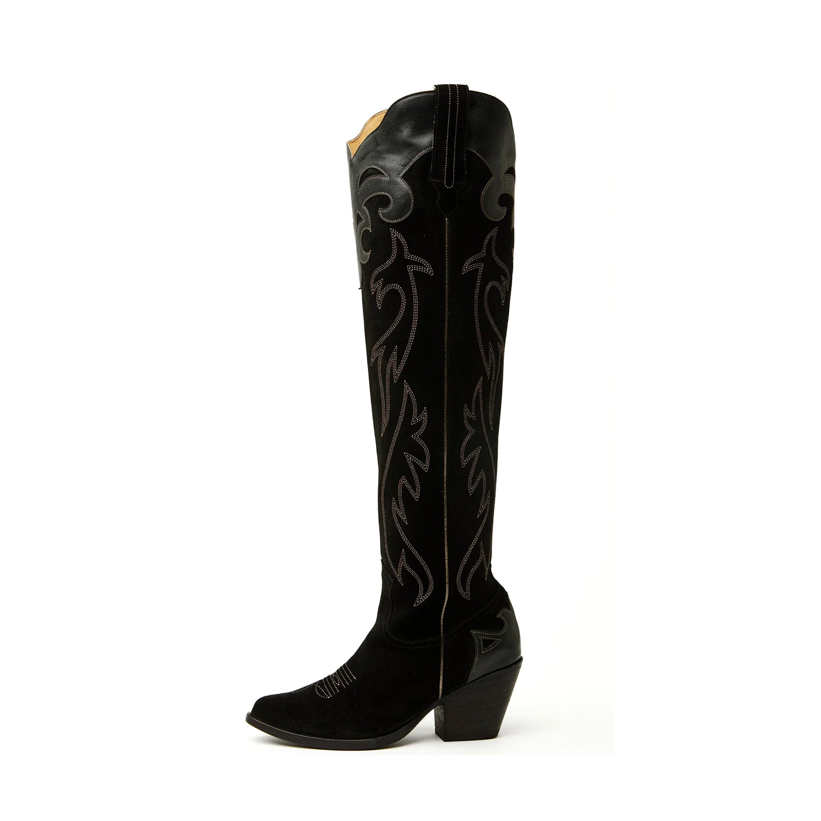 Black Faux Suede Round-Toe Half-Zip Embroidery Tall Knee High Cowgirl Boots.
