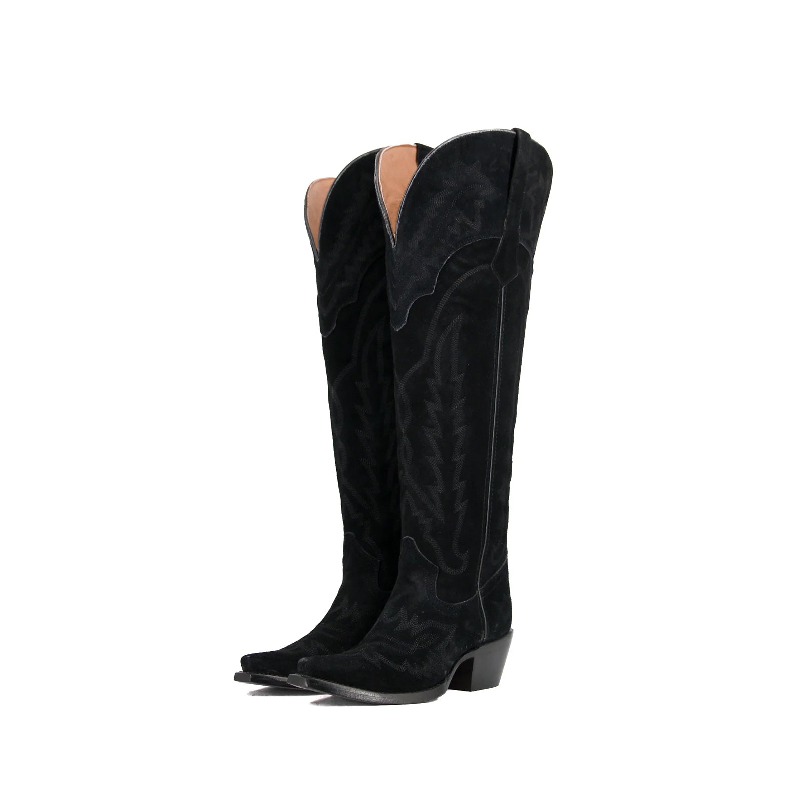 Black Faux Suede Snip-Toe Embroidery Half-Zip Knee High Cowgirl Boots