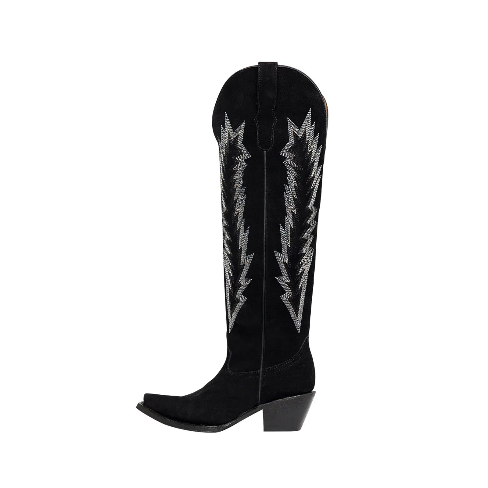 Black Faux Suede Snip-Toe Embroidery Wide Calf Over-The-Knee Cowgirl Boots.