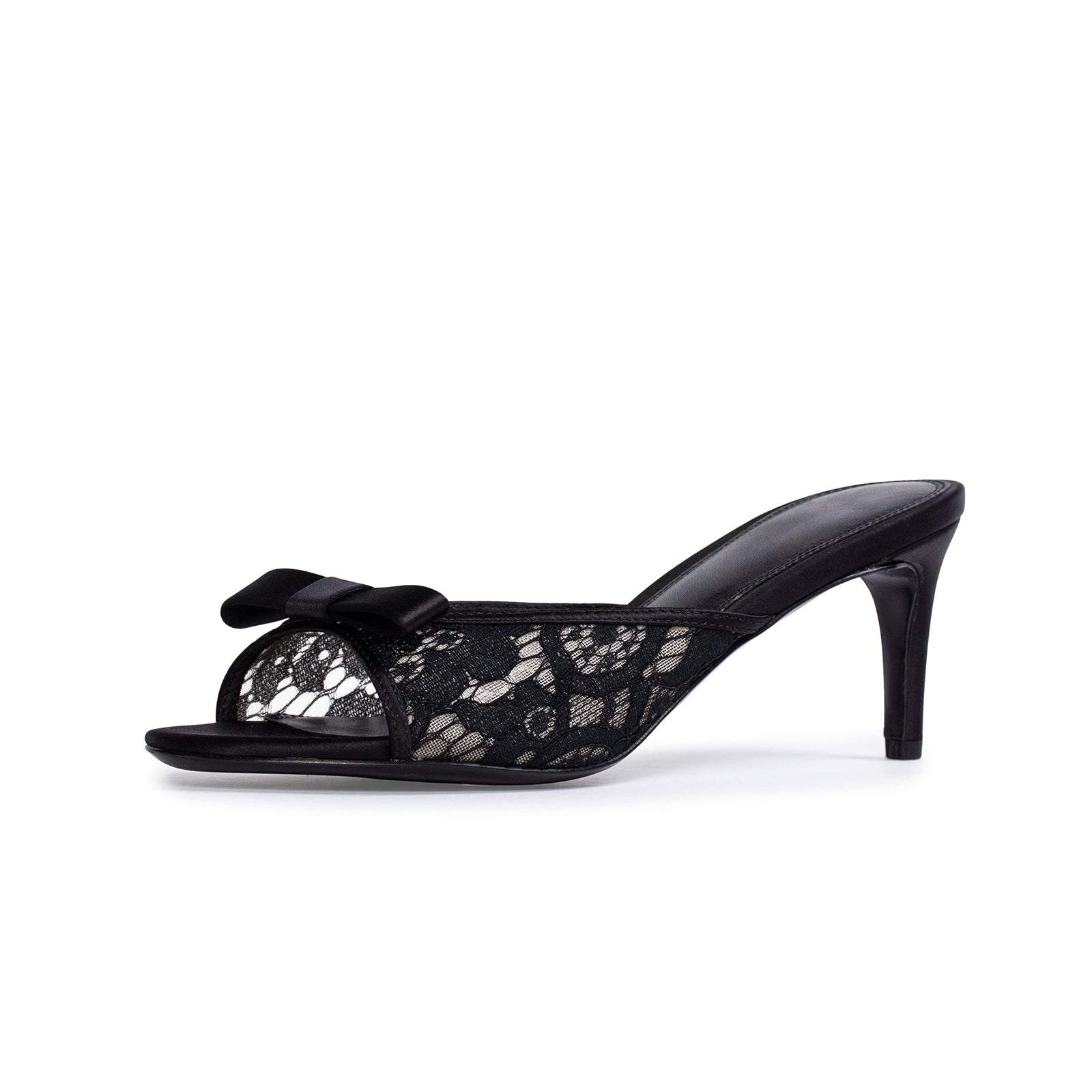 Black Lace Satin Round-Toe Front Bow Backless High Heels.