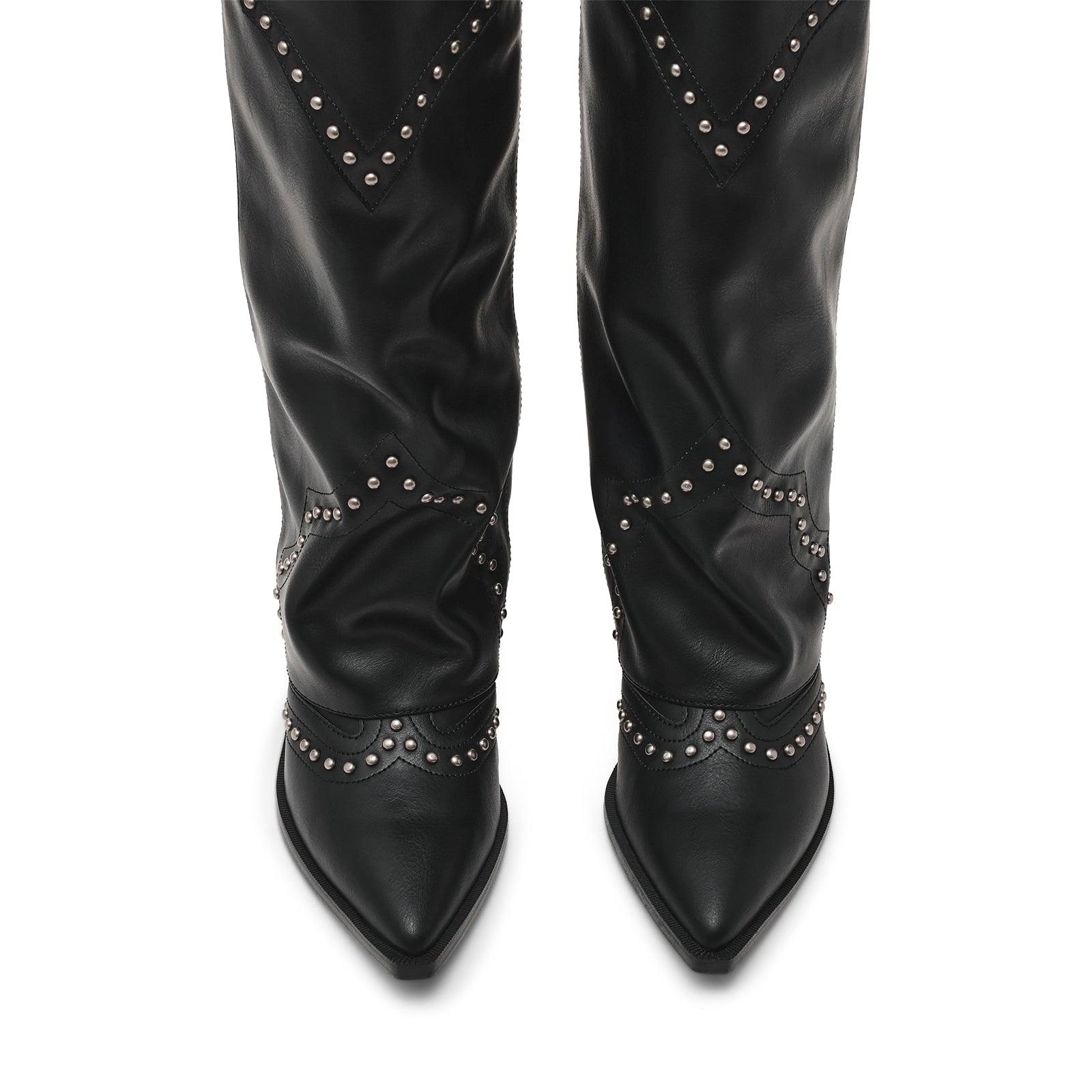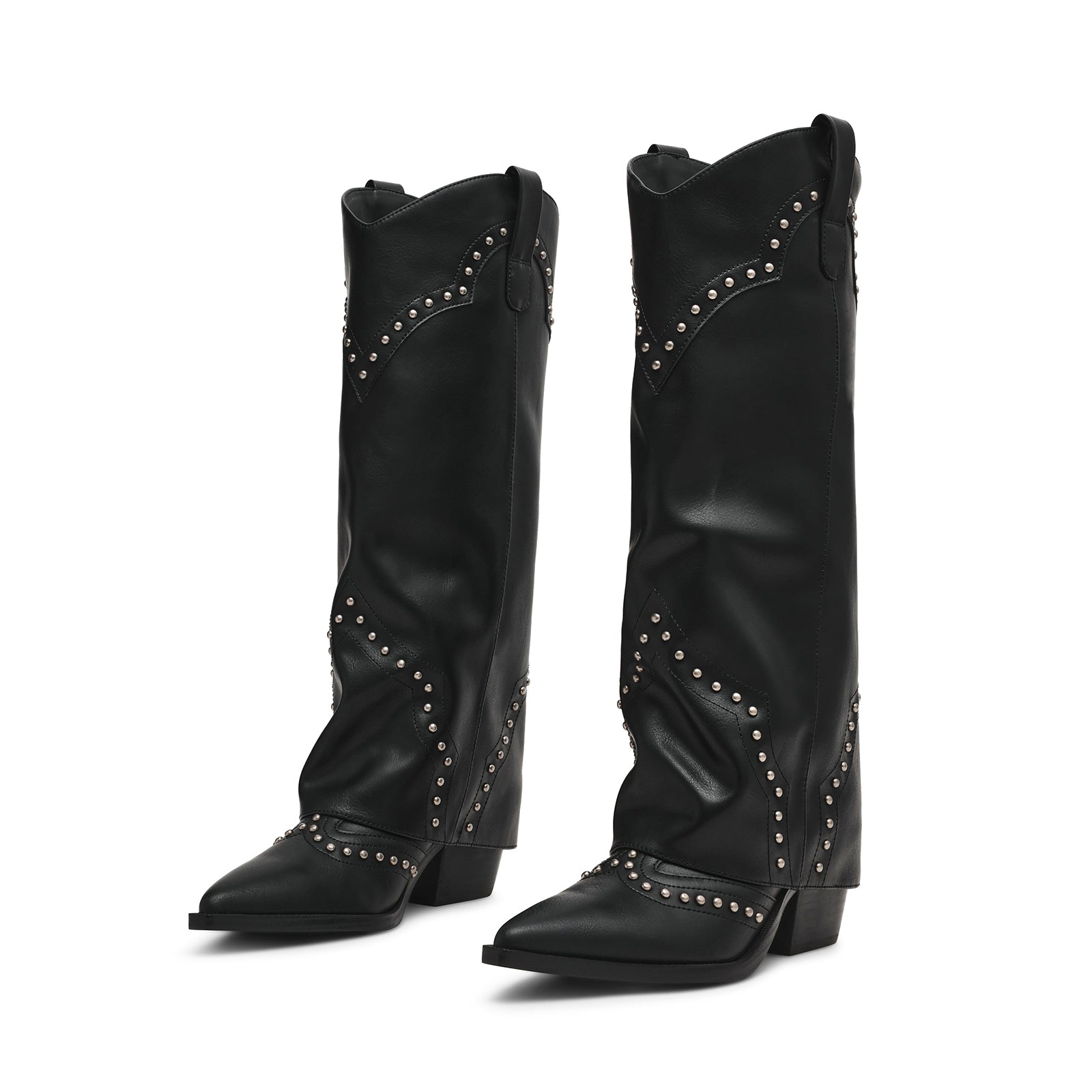 Black Pointed-Toe Studded Fold-Over Wide Calf Knee High Cowgirl Boots.