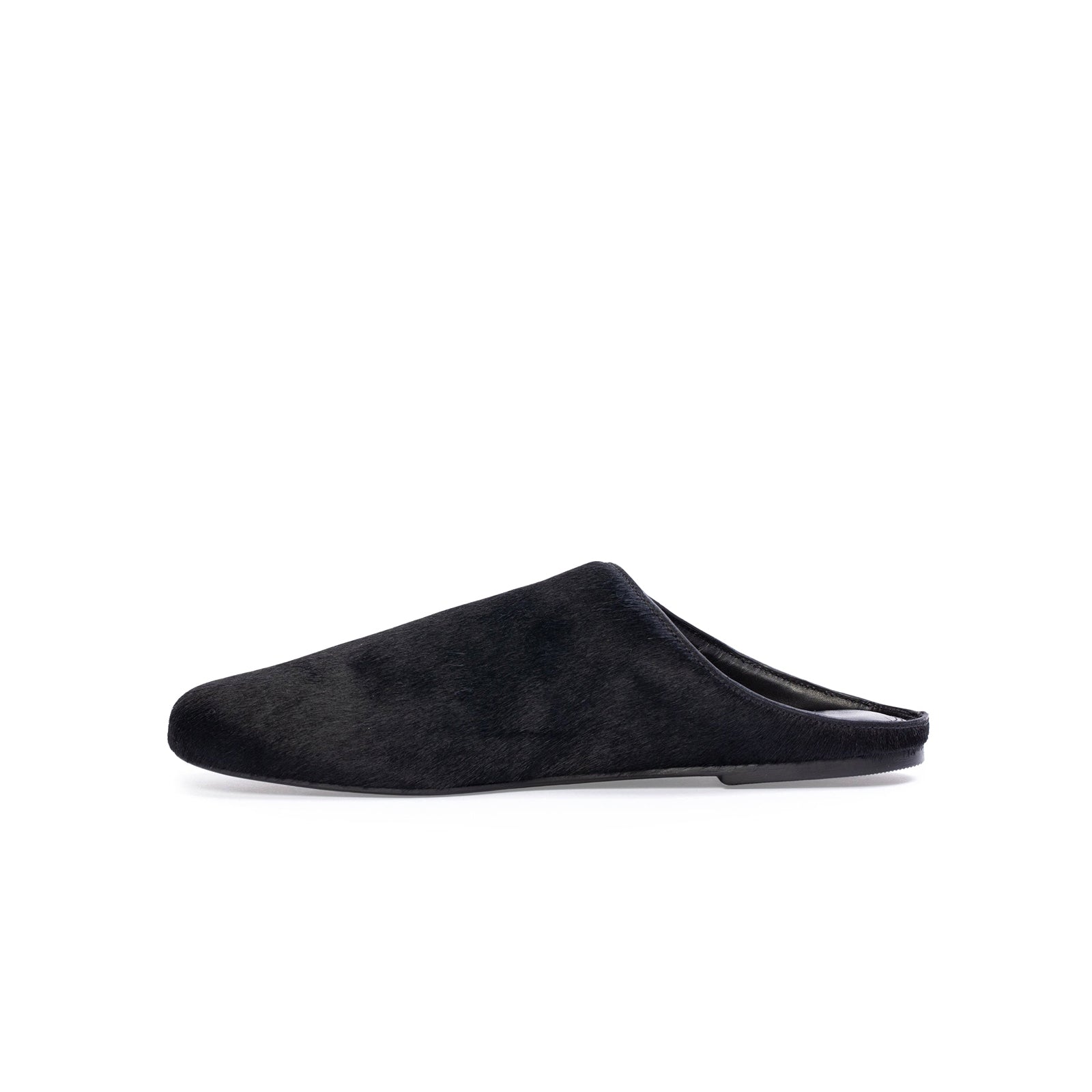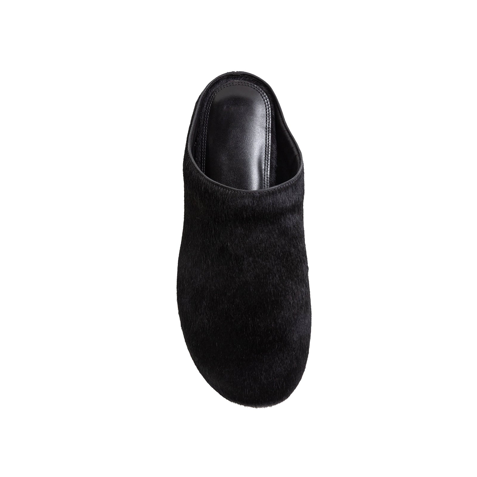 Black Pony Hair Round-Toe Slip-on Backless Ballet Flats.