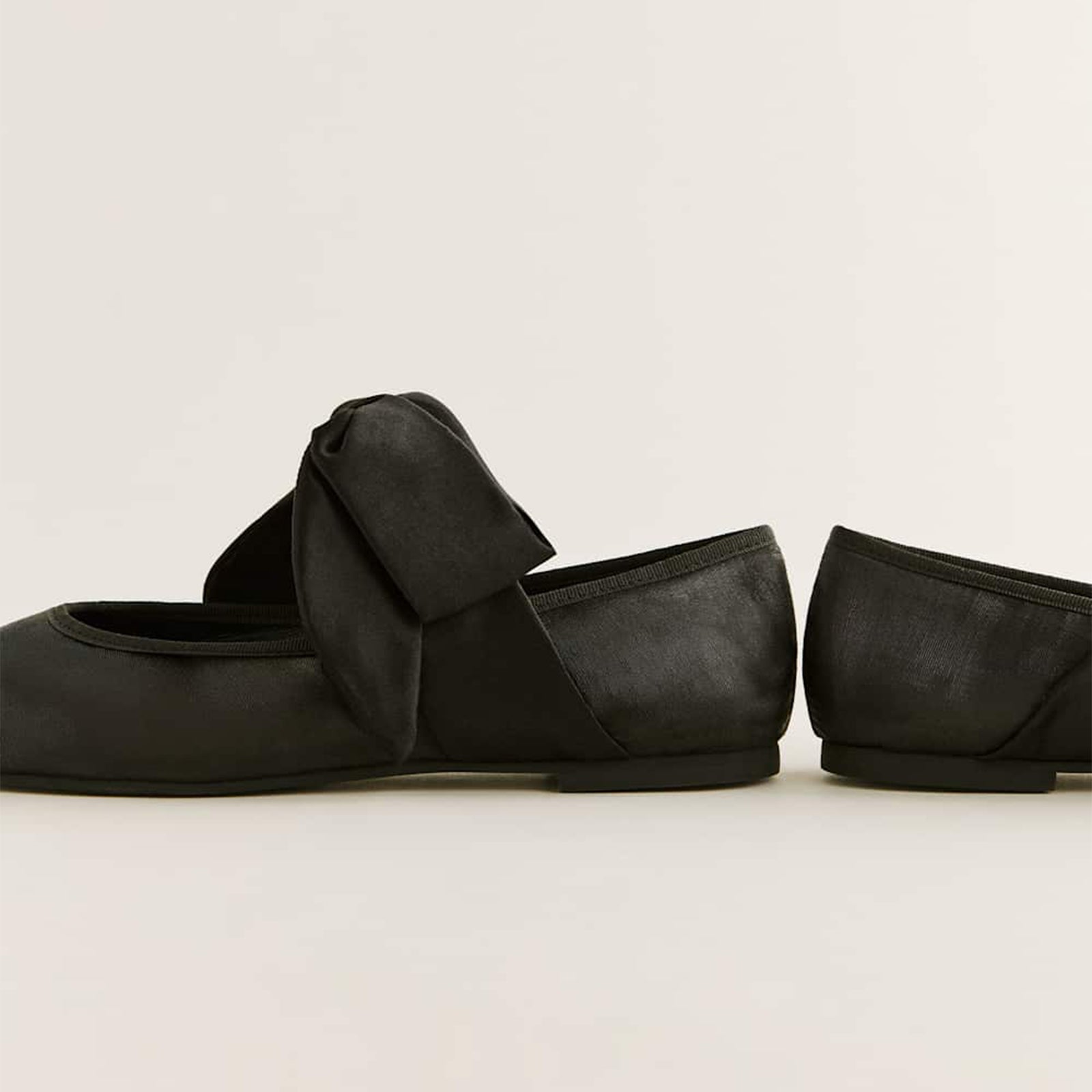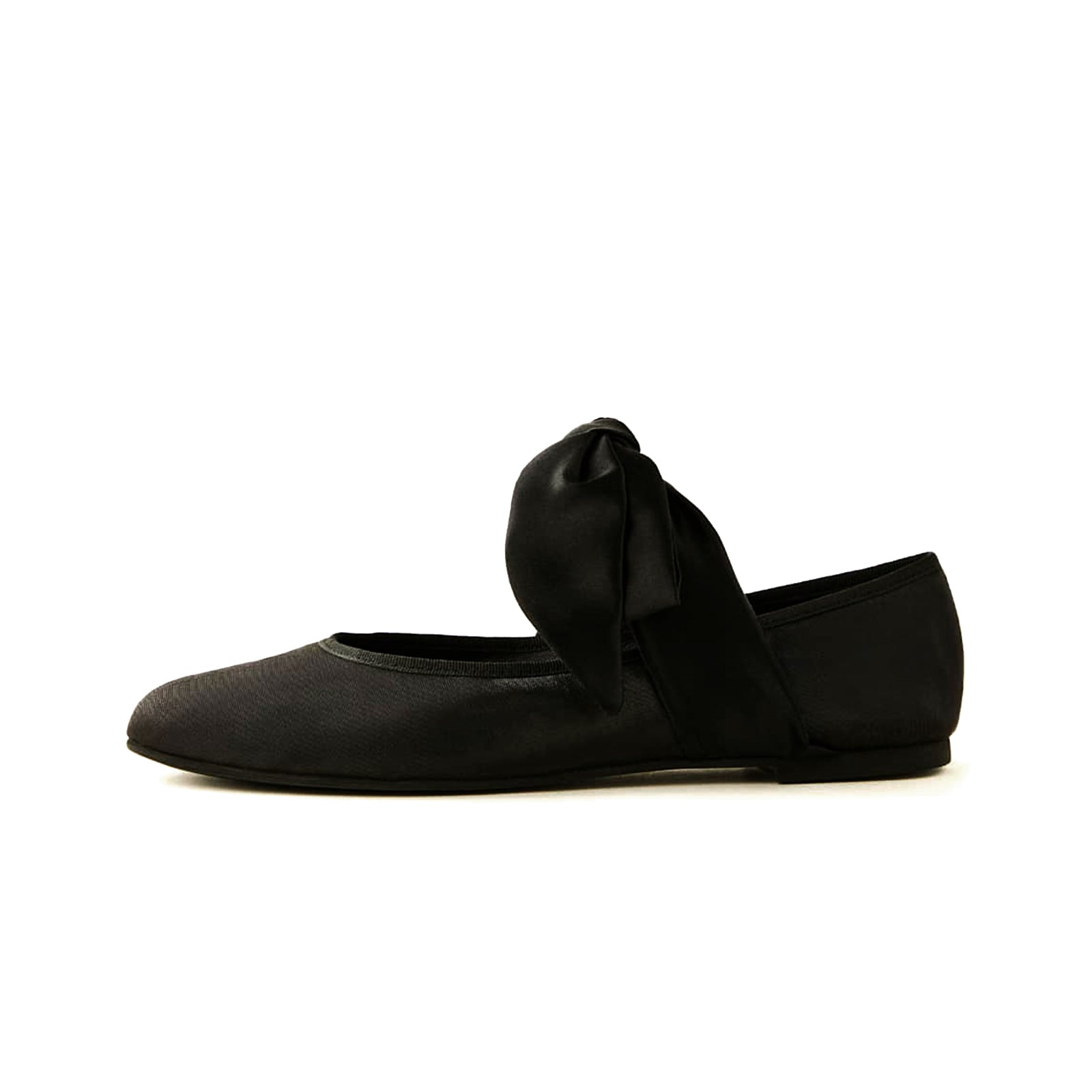 Black Satin Round-Toe Bridge Bow Strap Ballet Flats.