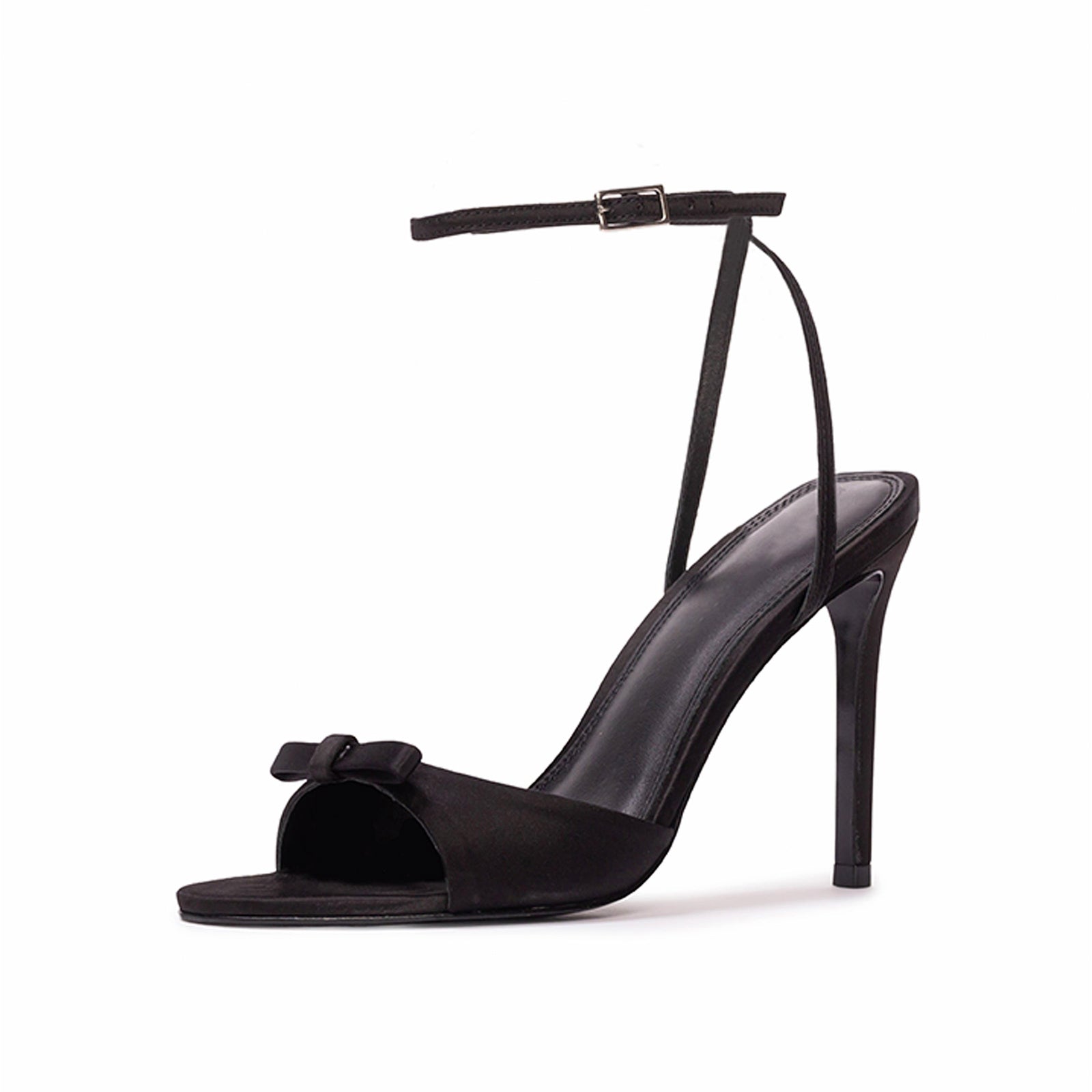 Black Satin Round-Toe Front Bow Ankle Strap High Stiletto Heels.