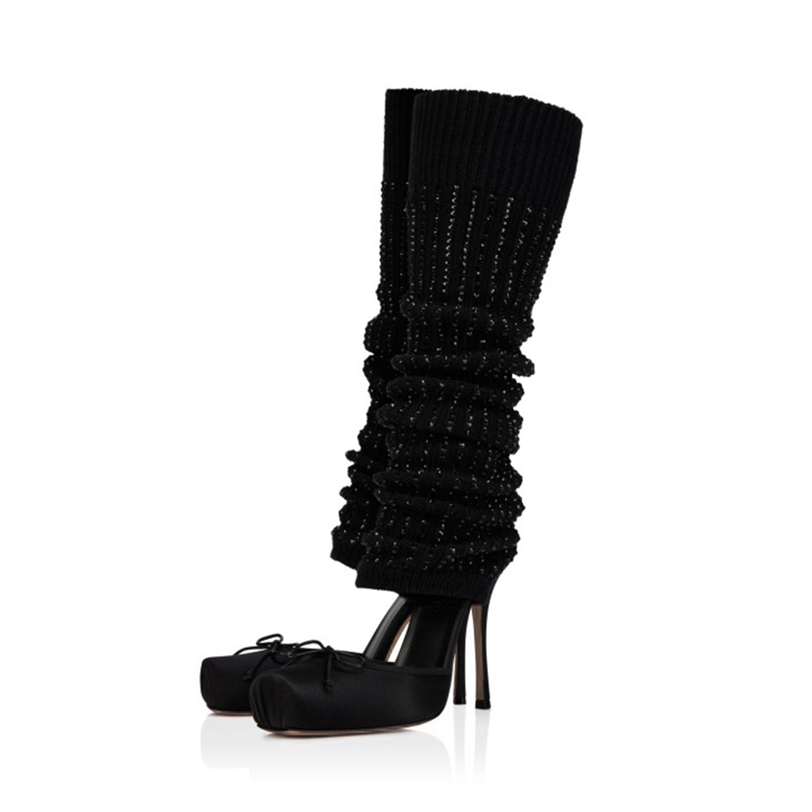 - Smooth satin upper paired with a soft woolen shaft for a striking texture contrast.