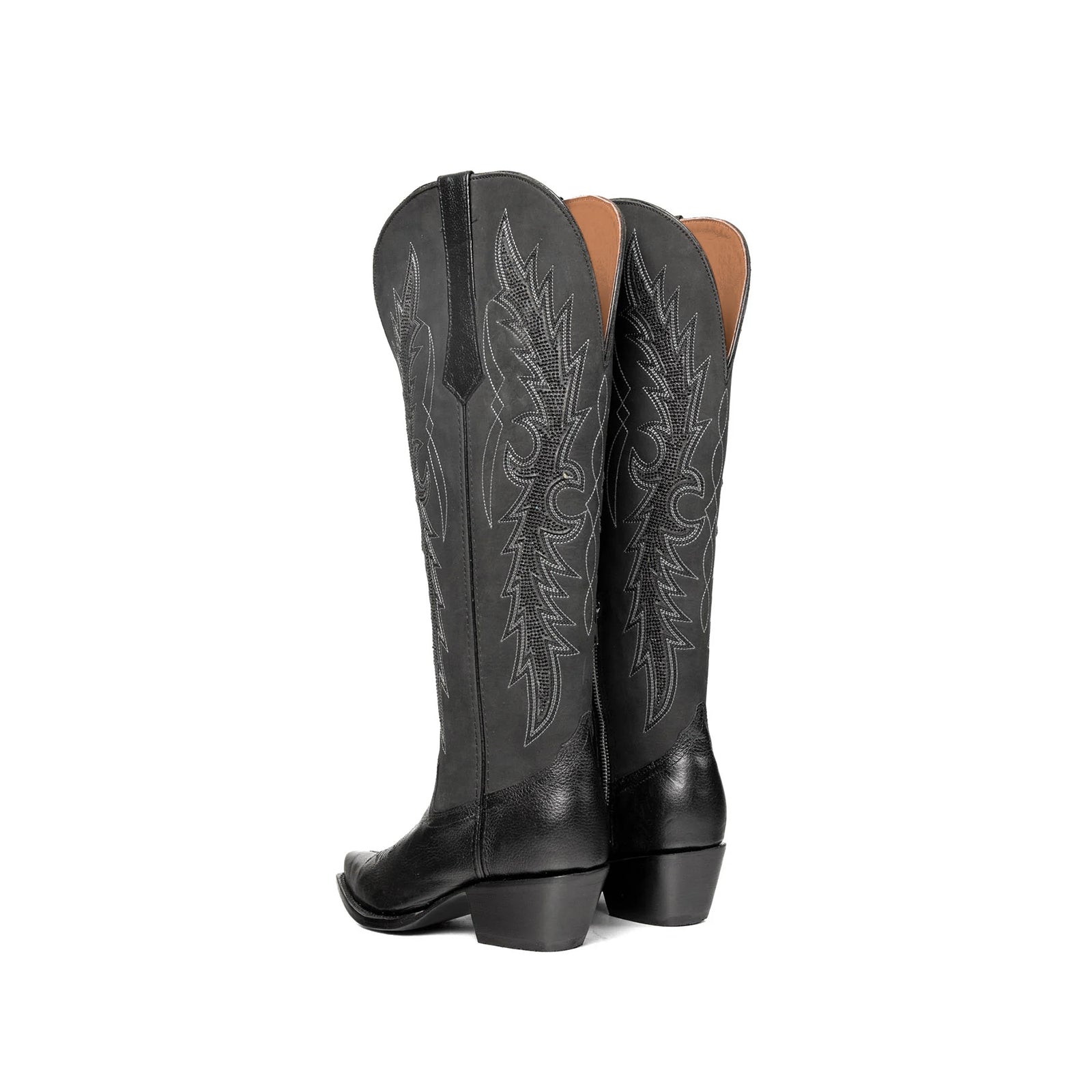Black Snip-Toe Black Rhinestone Embroidery Half-Zip Knee High Cowgirl Boots.