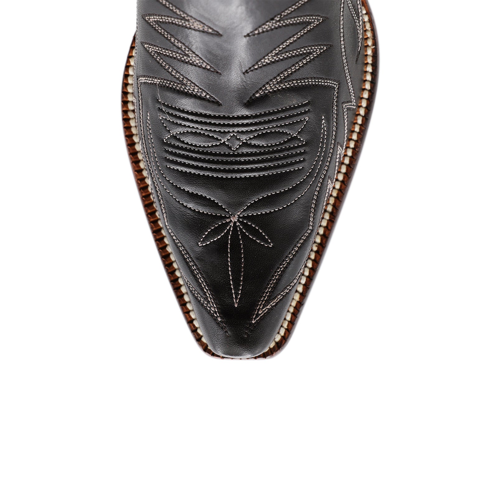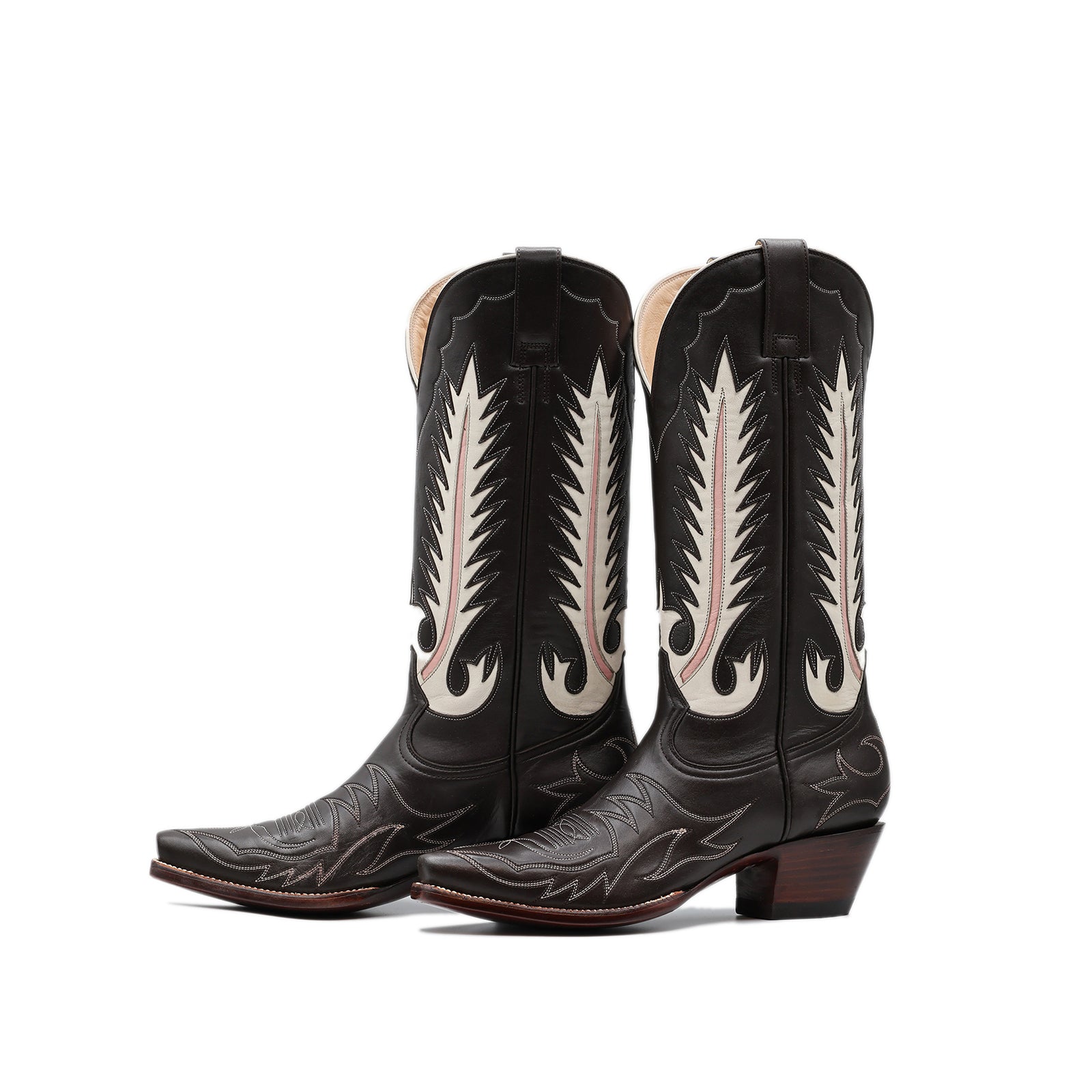 Timeless and refined, these boots blend detailed inlays with classic embroidery, creating a bold Western statement in sleek vegan leather.