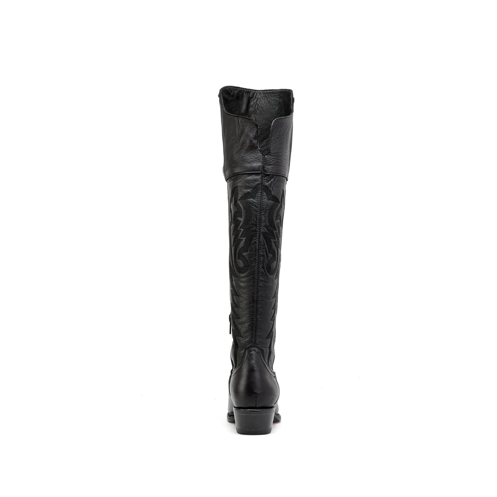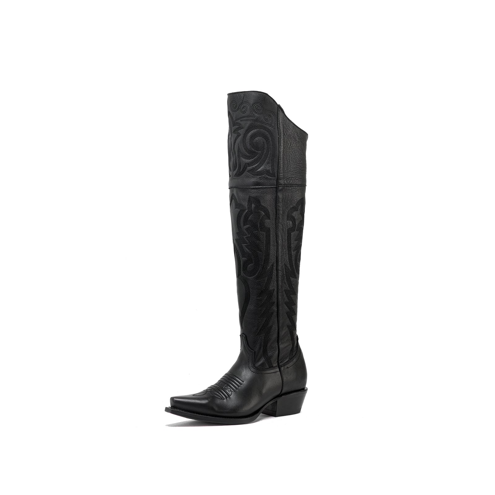 Black Snip-Toe Embroidery Half-Zip Knee High Cowgirl Boots