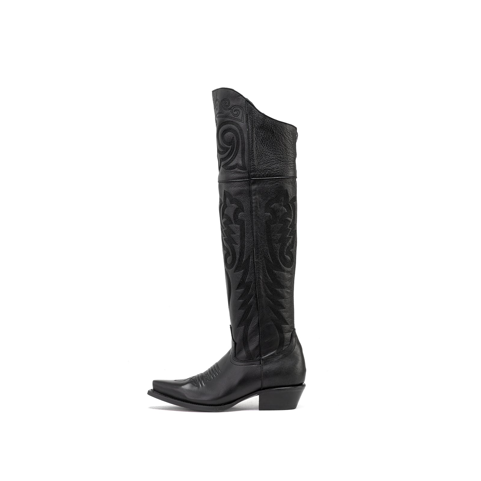 Black Snip-Toe Embroidery Half-Zip Knee High Cowgirl Boots.