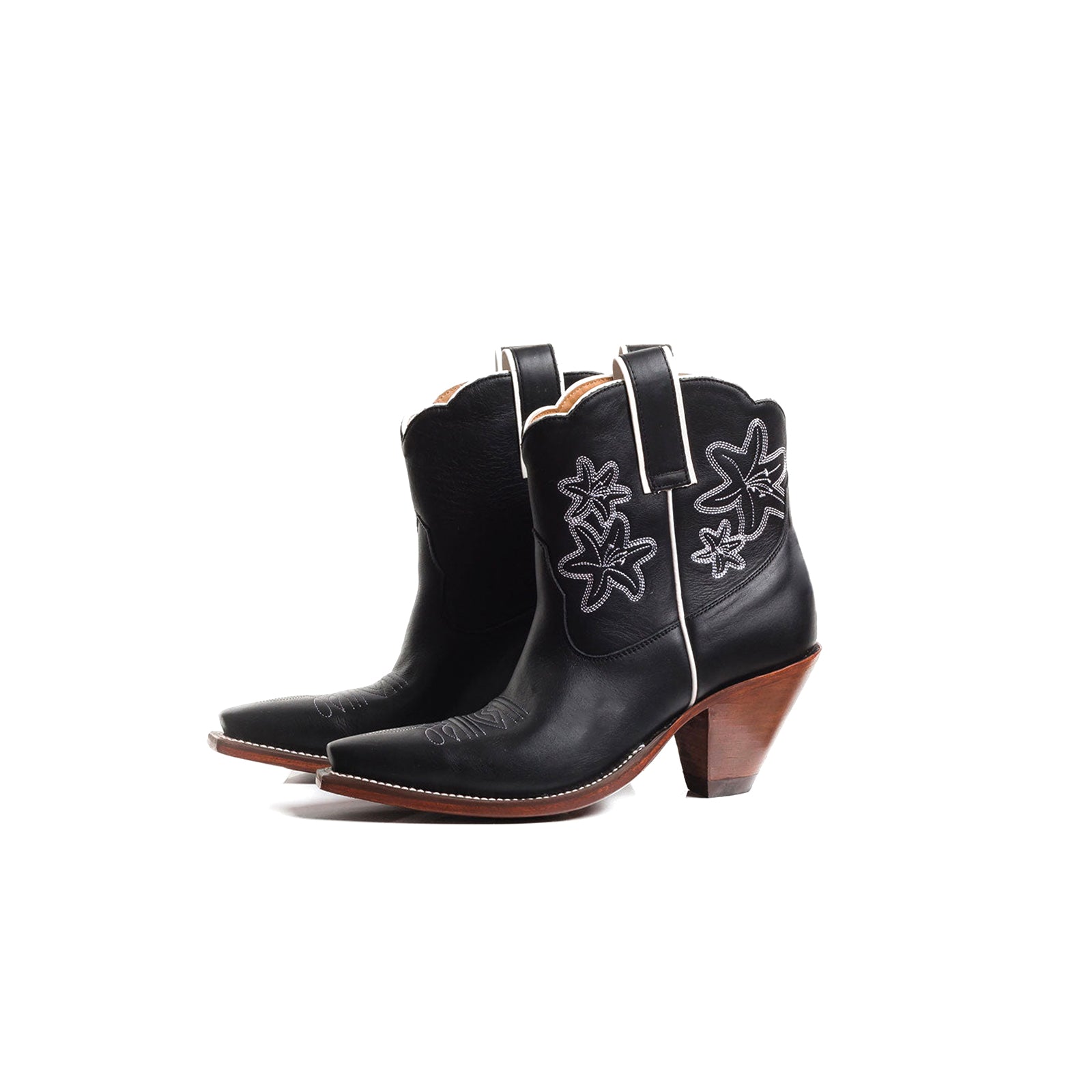 Black Snip-Toe Flowers Embroidery Ankle Cowgirl Boots